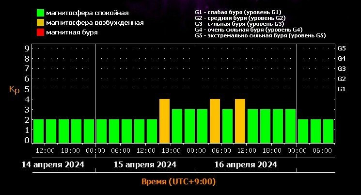 Как указано на сайте лаборатории, 15 апреля волнения в магнитосфере начнутся с 18:00 и продлятся до конца дня 16 апреля. Пики возмущений придутся в этот день на 6.00 и 12.00.