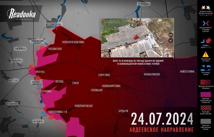 На Авдеевском направлении российские войска водрузили флаг на западной окраине в Новоселовке Первой. К западу от Прогресса дронами поражен очередной M2A2 Bradley ВСУ.