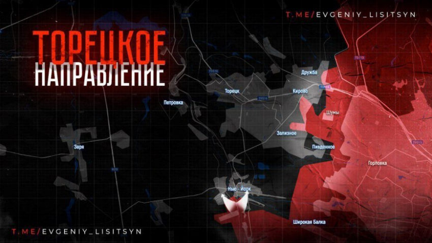 На Торецком направлении с тяжелыми боями ВС РФ продвигаются в центре Новгородского (Нью-Йорка). По имеющимся данным, российская армия перешла через речку в центре и закрепились севернее. Упорные бои идут и в Железном, а также с юго-восточной стороны от Торецка - в Дружбе и Дачном, информирует военкор Евгений Лисицын в Telegram-канале.