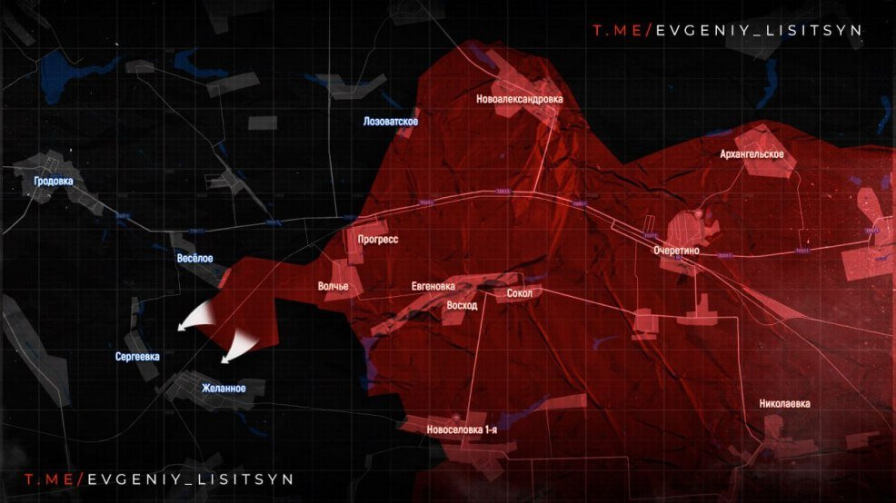 На Покровском направлении российская армия продолжает проламывать оборону противника, заставляя его отступать. Вчера пришли сообщения, что ВС РФ вышли к окраинам Желанного. Здесь российские силы двигаются вдоль ЖД полотна. Также наши бойцы продолжают атаковать село Веселое: несколько дней назад они подошли к нему с востока, а вчера - с северной части. Также фиксируется продвижение российской армии и чуть южнее. Здесь завершается зачистка Новоселовки Первой.