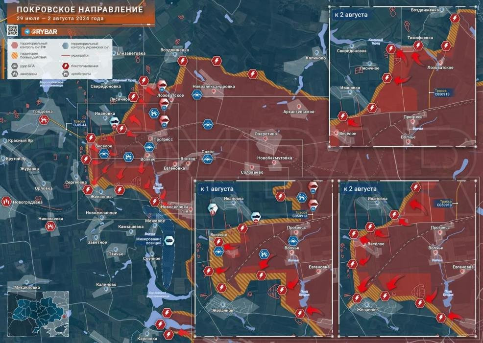 На Покровском направлении российские войска установили контроля над южной частью Тимофеевки, а также освободили Веселое. Одновременно продолжается наступление ВС РФ в сторону Желанного, пишет Telegram-канал "Рыбарь".