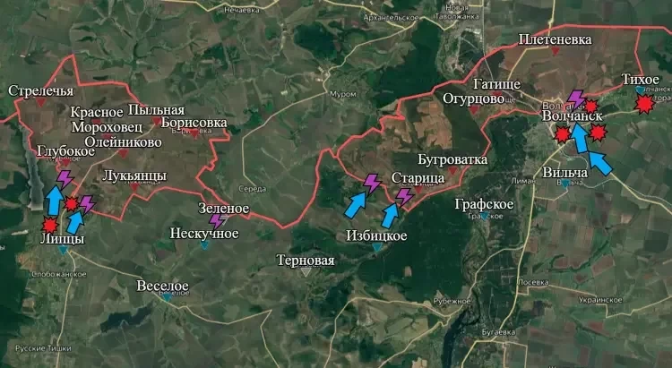 На восточном участке основная часть боевых действий происходит в Волчанске. Уличные бои не стихают в районе Волчанского агрегатного завода и в квартале многоэтажек. Ни у одной из сторон нет сокрушительного преимущества, которое позволило бы выбить оппонента с территории, сообщает PulsePen.