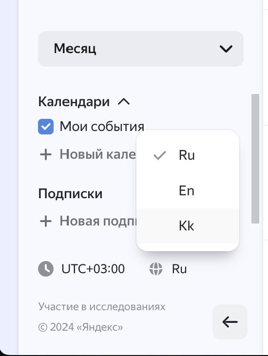 Интерфейс Календаря теперь доступен на трех языках. К традиционным русскому и английскому языкам добавили казахский. Изменить настройку можно в левом нижнем углу экрана: иконка для этого находится рядом с обозначением часового пояса. Теперь иностранные пользователи имеют больше возможностей для работы с сервисом на языке, который им удобен.