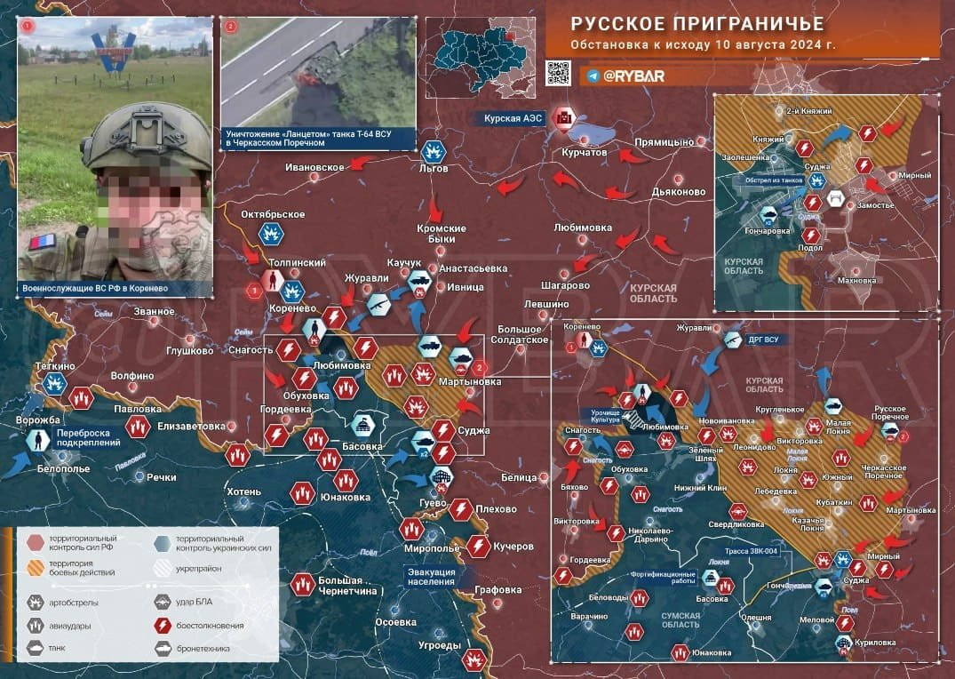 Подтянувшиеся резервы ВС РФ позволили нашим бойцам выбить противника из Малой Локни и Мартыновки. ВСУ при этом продолжают стягивать в Суджанский район подкрепление, меняя тактику действий с рейдерских прорывов на общевойсковую операцию - киевское командование подключает к наступлению танковые и механизированные подразделения. Главной целью врага остается Курчатов и АЭС - силы ВСУ концентрируются в районах Любимовки и Обуховки.