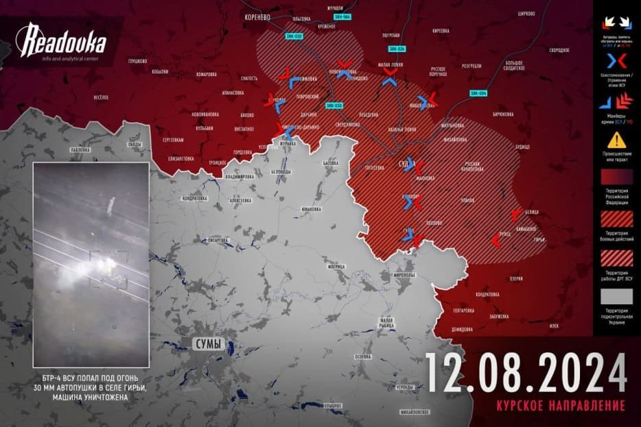 На Курском направлении противник предпринял попытку атаки со стороны рубежа Спальное - Крупец в направлении села Гирьи, где в ходе атаки потерял до десятка единиц бронетехники, большинство из которых составили БТР-4Е, одну из которых удалось взять в качестве трофея.