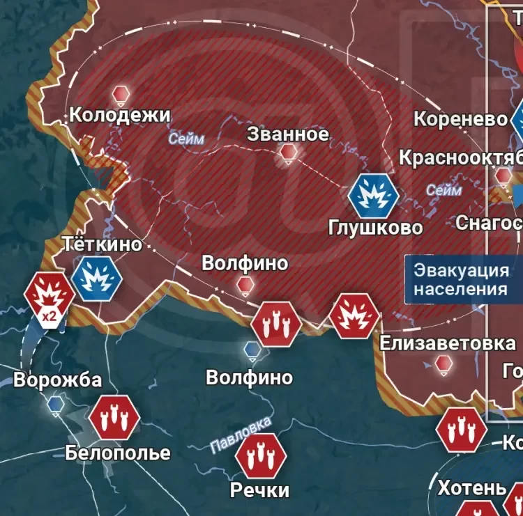На юго-западе Курской области объявлена эвакуация из Глушковского района. Связано это с обострением обстановки на участке и постоянными обстрелами ВСУ населённых пунктов, включая Тёткино и Глушково. Враг нанёс удар из РСЗО HIMARS по мосту в Глушково – повредил его, но не уничтожил. Чуть позже в Сумской области была уничтожена установка РСЗО M142 HIMARS производства США. Возможно, та самая. Обстановка в Тёткино, хоть и напряжённая, но стабильная.