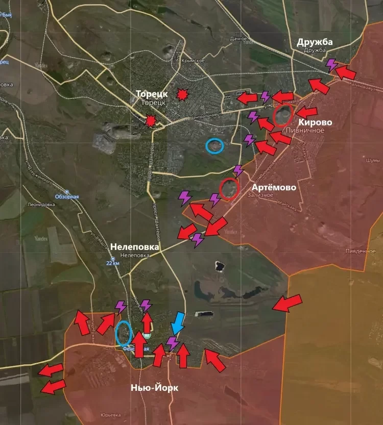 На Торецком направлении ситуация развивается стремительно. Подразделения ВС РФ продвинулись из Кирово в сторону Торецка, а также расширили зону контроля в Кирово и Дружбе. От Артёмово Армия России немного продвинулась в сторону Нелеповки.