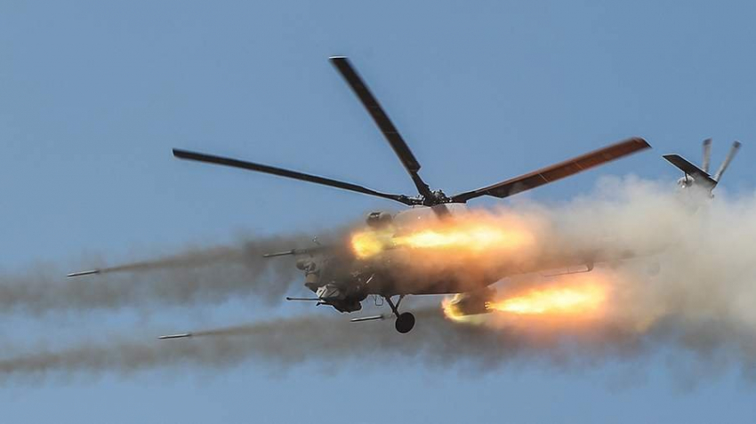 Применив вооружение, экпиаж вертолета благополучно вернулся на площадку, с которой осуществлялся взлет, сообщает телеканал "Звезда".