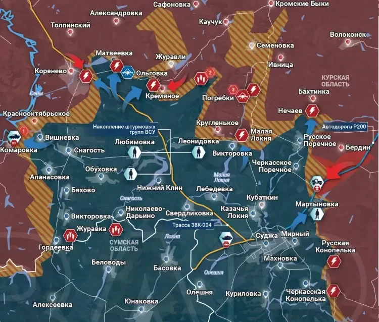 В Суджанском районе идут ожесточенные бои вдоль всей линии соприкосновения. Украинские мобильные группы пытаются продвинуться на нескольких участках, тогда как российские войска отвечают прицельными ударами по выявленным целям. На северном фланге подразделения ВСУ предприняли атаки в районе Малой Локни и Нечаева.