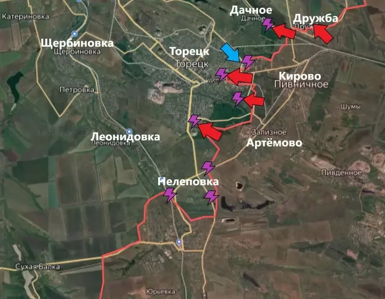 На Торецком направлении продолжаются бои в восточной и южной частях Торецка (Дзержинска). Российские штурмовые группы постепенно продвигаются вдоль улицы Центральной с целью расширить зону контроля в Торецке и осложнить снабжение подразделений ВСУ, ведущих оборону на терриконе шахты «Новая». По военной инфраструктуре противника в городе также регулярно работают артиллерия и авиация. Так, один из авиаударов был нанесен по ПВД ВСУ в центральной части населенного пункта.