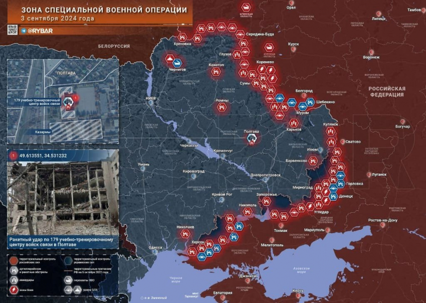 Утром 3 сентября ВС РФ нанесли ракетный удар по высшему военному командному училищу связи имени маршала Москаленко в Полтаве. Он произошел по территории в момент построения личного состава 128-й бригады. Решение о нападении на военную часть было принято с помощью местных жителей, которые сообщили о базе ВСУ.