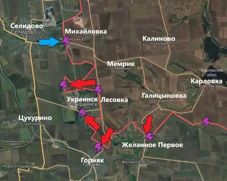 Однако всё это не касается ситуации на юго-востоке от Селидово. Там идёт активное наступление ВС РФ. Бои идут у Желанного Первого, к югу от Карловки, на подступах к Горняку. Но куда интереснее развиваются события вокруг Украинска, и "вокруг" - в прямом смысле. Наши бойцы смогли существенно продвинуться к северу от города. По сути, ВСУ контролируют лишь западные подступы к населённому пункту, где располагается террикон. Насколько хорошо он укреплён и оборудован - неизвестно. С нашей стороны также пока доподлинно не известно, стоит ли цель полностью окружить город или же нет.