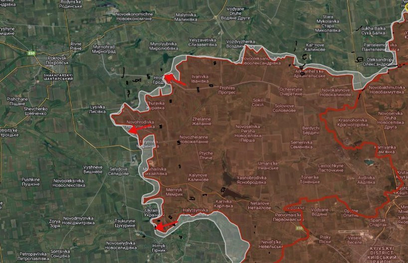 На Покровском направлении в Гродовке российские войска расширили контроль территории вдоль улиц Казацкая и Мирная, давят в направлении перекрёстка улиц Донецкая и Вишневая.