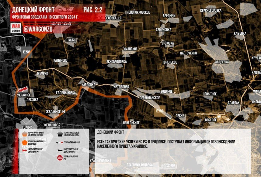 Обновлённая карта боевых действий на Украине по данным на 12:00 мск от 18.09.2024