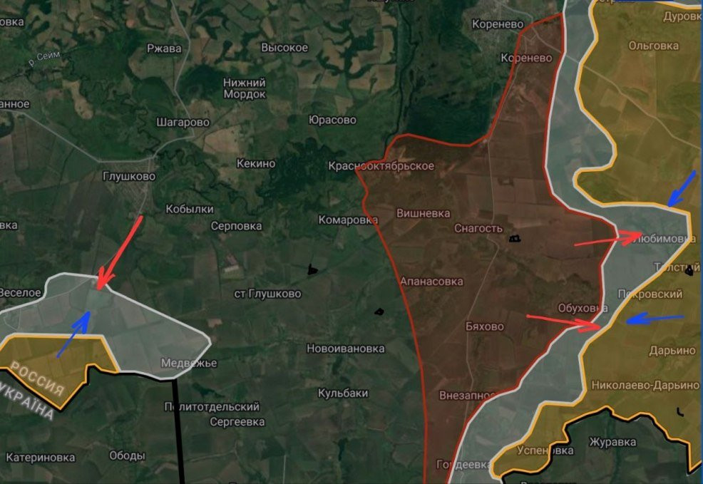 Что говорит о возможном замысле противника вернуться к попытке нанесения нам еще одного удара в Курской области с прицелом на Рыльск. Похоже, что именно здесь противник может попробовать попытать свое счастье еще раз (и заодно решить свои проблемы на участке южнее Коренево).