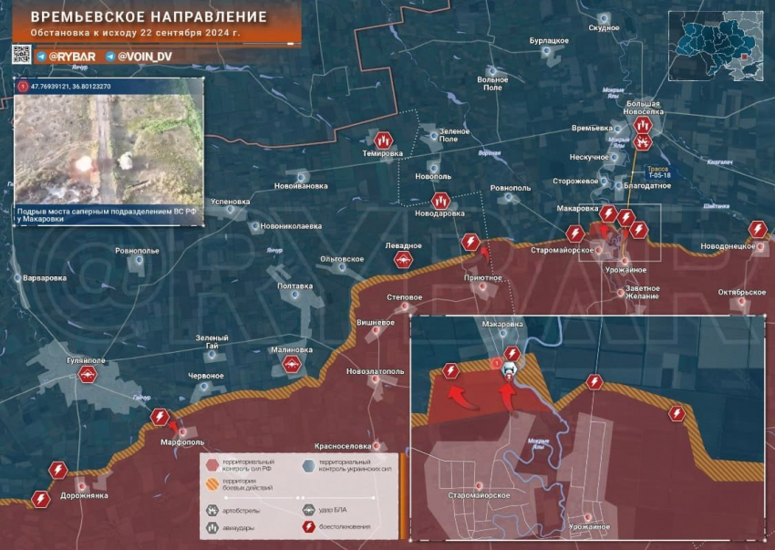 На Времьевском направлении уточнена конфигурация фронта в районе Макаровки, где российские саперы взорвали мост южном на въезде в село.