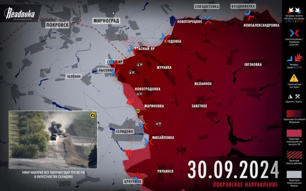 На Покровском направлении бронегруппа ВС РФ атаковала позиции противника к западу от Мариновки на северном въезде в Селидово.