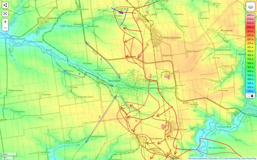 На Селидовском направлении наши войска южнее города продолжают медленно, но уверенно продвигаться к населенному пункту Вишневка. Параллельно их товарищи севернее города также имеют успехи. На первой карте Подоляки видно, что взятие Вишнёвки фактически ведёт к окружению ВСУ в Селидово.