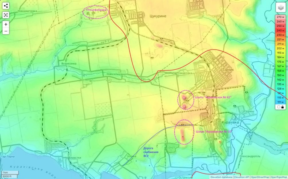 Примечательно, что после освобождения Угледара наши войска смогли выйти с юга к реке Волчья восточнее Курахово и взять под огневой контроль проходящую здесь трассу снабжения между Курахово и городами Горняк и Кураховка. Что сильно усложняет логистику частям ВСУ в этих городах.