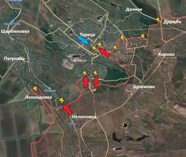 В Торецке завершена зачистка высотного района к востоку от шахты «Центральная». Идут тяжелые бои в Леонидовке, информирует в своем Telegram-канале военкор Евгений Лисицын.