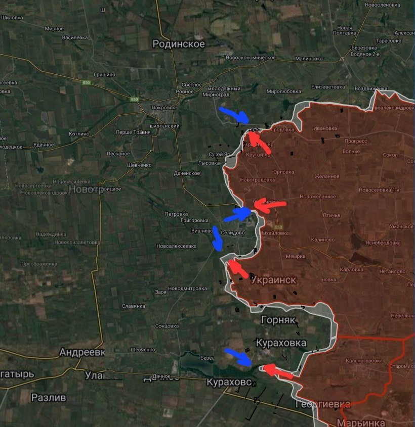 В сводке говорится, что ВС РФ обходят и берут в клещи Селидово. Также уточняется, что на северном фланге покровского направления продолжаются бои западнее Николаевки и Новогродовки. Восточнее Селидово российские силы зашли на территорию завода ЖБИ, который потенциально может стать плацдармом для дальнейших атак в направлении шахты.