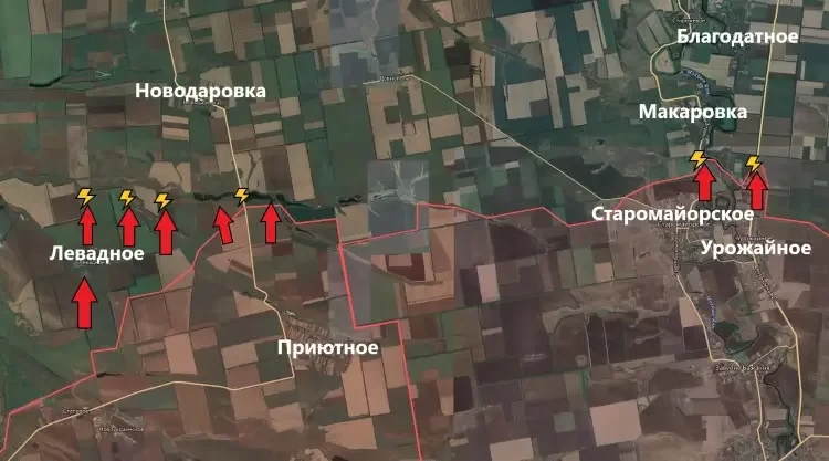 А вот чуть западнее Армия России существенно расширила зону контроля севернее недавно взятого под контроль Левадного, а также северо-западнее Приютного.