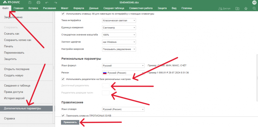 Для этого необходимо в редакторе таблиц «Р7-Офис» перейти во вкладку «Файл» и выбрать в меню пункт «Дополнительные параметры». В правой части экрана опция «Использовать разделители на базе региональных настроек» активна по умолчанию. Чтобы использовать особые разделители, необходимо снять флажок и в расположенных ниже полях «Десятичный разделитель» и «Разделитель разрядов тысяч» ввести нужные символы. Чтобы сохранить внесенные изменения, надо нажать кнопку «Применить».