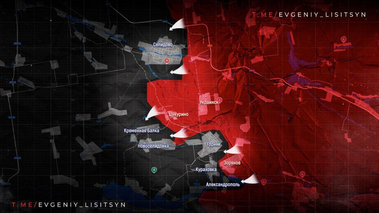 На Покровском направлении ВС РФ замыкают клещи вокруг Селидово - атакуют на северном и южном флангах, с запада начали бои за Вишневое. На востоке идут бои в южной части шахты Коротченко, сообщает в своем Telegram-канале военкор Евгений Лисицын.