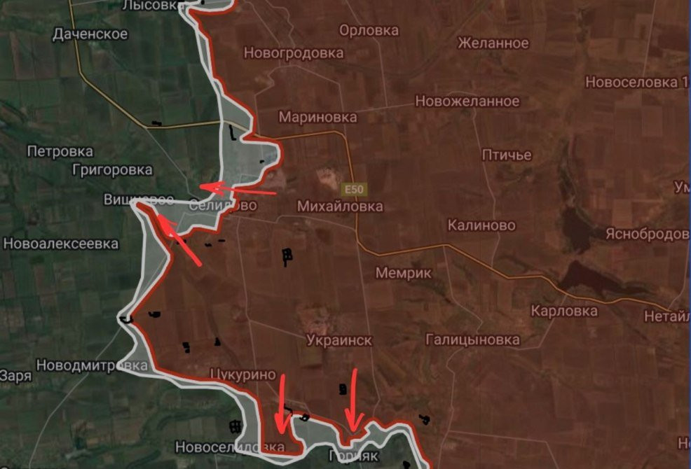 «Для чего брали Селидово и Горняк? Для того чтобы скатать в рулон ещё больший участок фронта... Главной целью наступления по-прежнему остаётся Покровск. Но важность задачи не означает смены методов, которые хорошо работают. Судя по действиям армии России, можно предположить, что вместо окружения отдельных городов могут попробовать практиковать окружение целых районов/карманов», - говорится в материале.