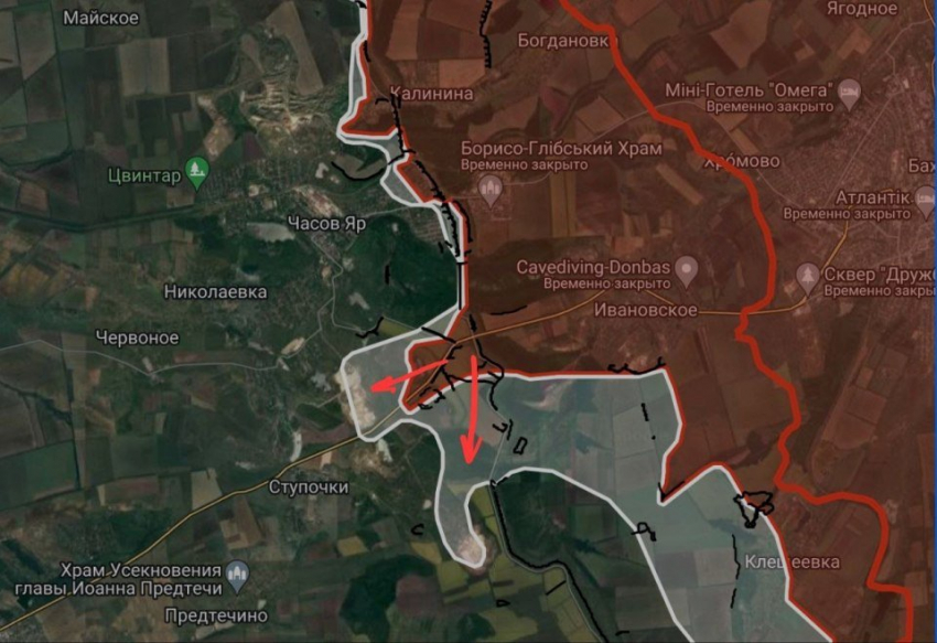 На ЧасовЯрском направлении южнее Часового Яра российские войска ведут штурмовые действия в районе рудника «Юго-восточный», имеются тактические успехи.