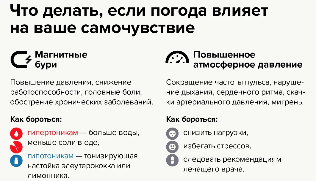 Врачи советуют метеочувствительным людям всегда под рукой держать прогноз солнечной активности и вероятных магнитных бурь. Тогда можно своевременно принять необходимые профилактические меры. Если состояние здоровья по тем или иным причинам стало ухудшаться, а медикаменты не помогают, не медлите, срочно вызывайте скорую помощь.