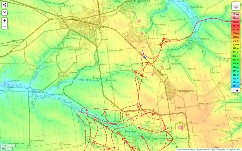 Западнее Селидово продолжаются бои за Пустынку (чтобы расчистить путь группировке «Центр» на запад), а самым важным вчерашним достижением стало занятие нами серьезных оборонительных позиций противника в северной части Петровки и Григорьевки, с переходом этих сел под наш контроль. Это заметно упростит нам дальнейшее движение на северо-запад, к предместью Покровска н.п. Шевченко.