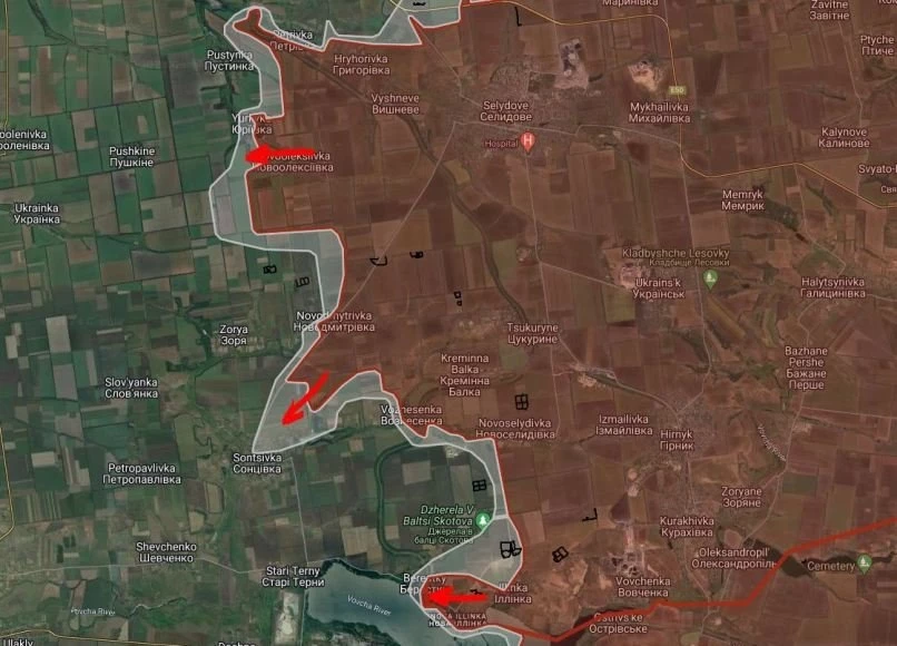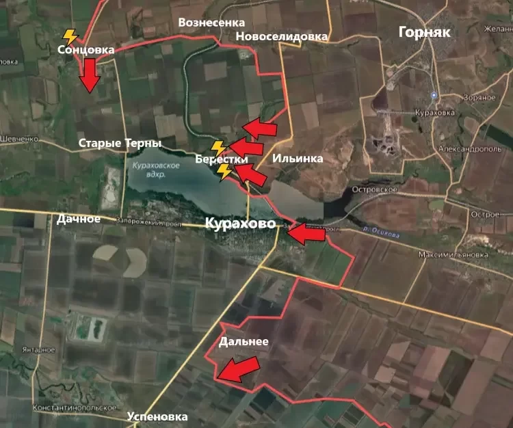 На Кураховском направлении подразделения ВС РФ заняли южную часть Сонцовки. Предположительно, противник ещё находится на северо-западных окраинах населённого пункта. Если это и так, то осталось ему недолго. В скором времени село будет освобождено Армией России. И тогда откроется путь (хотя, технически он уже открыт) на Старые Терны. Да, ВСУ подорвали дамбу в западной части Кураховского водохранилища, так что продвижение дальше на юг будет серьёзно осложнено. Но взятие Старых Терн позволит установить огневой контроль над единственной оставшейся дорогой снабжения ВСУ в Курахово.