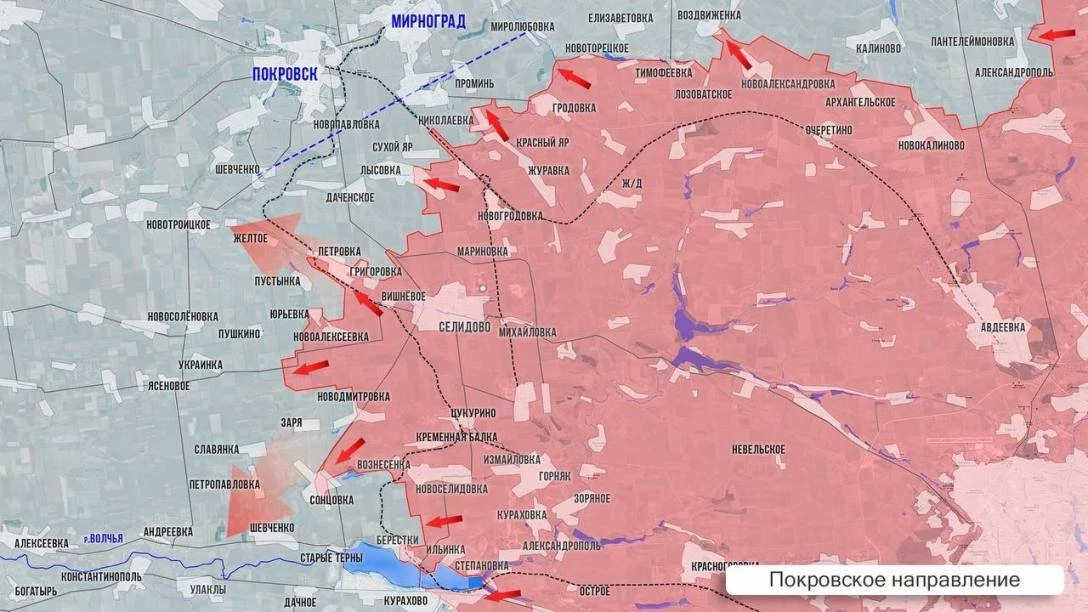 На Покровском направлении продолжаются ожесточенные бои в районе Николаевки и к югу от Лысовки, российские войска также наступают в сторону Пустынки и Желтого.
