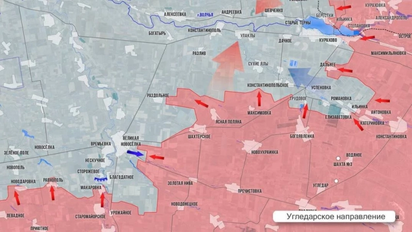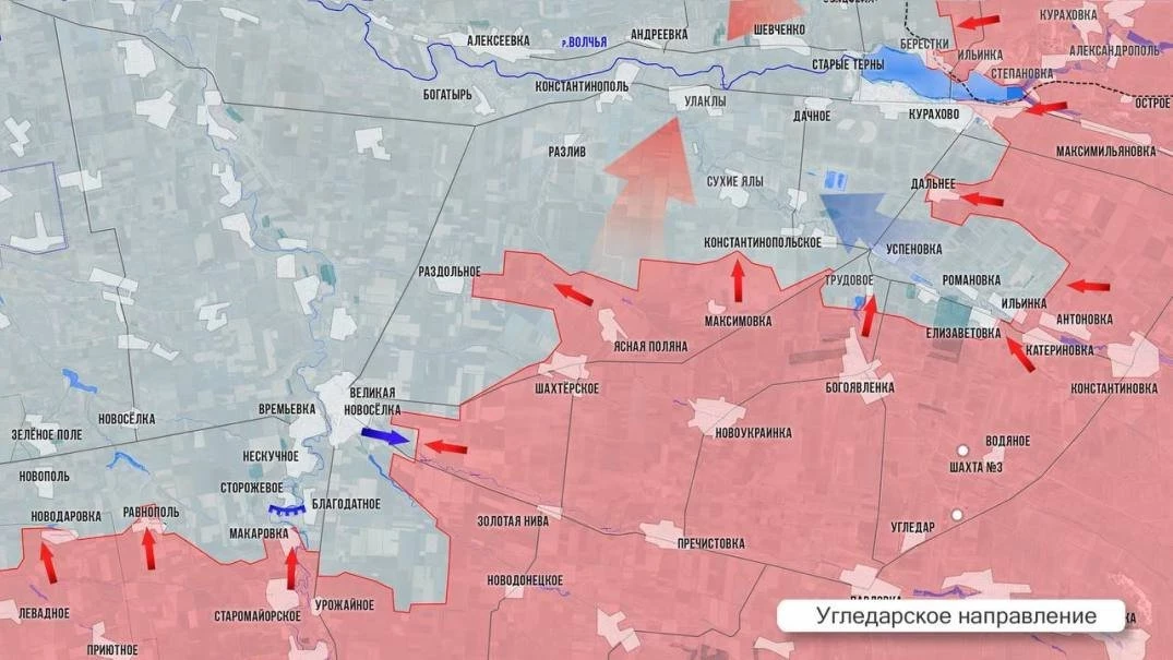 На Угледарском направлении ВС РФ дошли до окраин Великой Новосёлки. За три дня наши подразделения преодолели около 9 км, минно-взрывные заграждения, сопротивление опытных FPV-расчетов, несмотря на дожди, сегодня уже продавливают позиции врага в восточной части поселка. Развивается наступление в междуречье рек Кашлагач и Шайтанка. Село Раздольное, что севернее на трассе по большей части под нашим контролем. Западнее него ВСУ огрызаются только в ротном опорном пункте вдоль дороги. Северо-западнее Шахтёрского идут бои за лесополосы. В Трудовом ВС РФ заняли новые позиции в центре села. Южнее Курахово продолжается ликвидация кармана: ВС РФ контролируют Елизаветовку, Ильинку и частично Романовку.