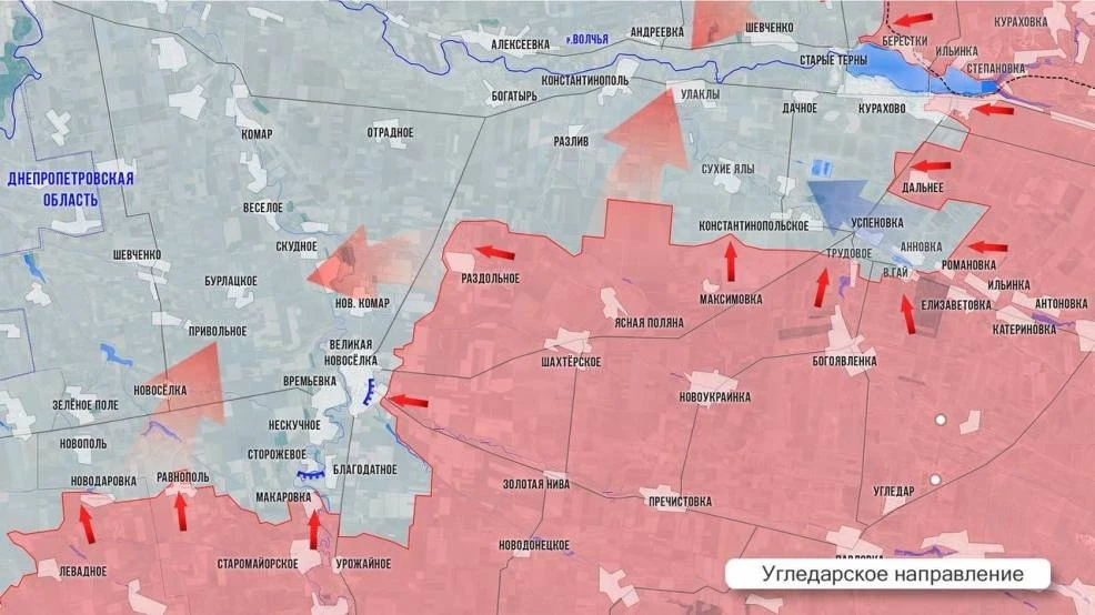На Угледарском участке наши отбили у ВСУ важную позицию на дороге от Шахтёрского, продвинулись севернее р.Кашлагач и встали широким фронтом на окраине Великой Новосёлки - копят силы и готовят штурм. Южнее ВС РФ закрепляет успех в Раздольном и намерены с запада, через Ровнополь и Новодаровку, взять под контроль часть трассы на Гуляйполе. Маневр создаст котел для ВСУ в этом районе, отрезав их силы южнее Великой Новсоселки. Севернее Ясной Поляны ВС РФ атакуют по направлению к Разливу, до него менее 4 км. Цель - выйти на Константинополь и взять под огневой контроль участок трассы Н15. Наши чуть продвинулись к Сухим Ялам, западнее бьются за Константинопольское, расширяют зону контроля западнее Трудового, давят от Дальнего к Успеновке, в районе Анновки, Романовки и Весёлого Гая. И Елизаветовки и леса рядом ВСУ в спешном порядке выводят остатки сил. Активные бои в Курахово, где под контролем наших войск почти весь центр, включая ~70% многоэтажек. Наш флаг поднят на здании школы.