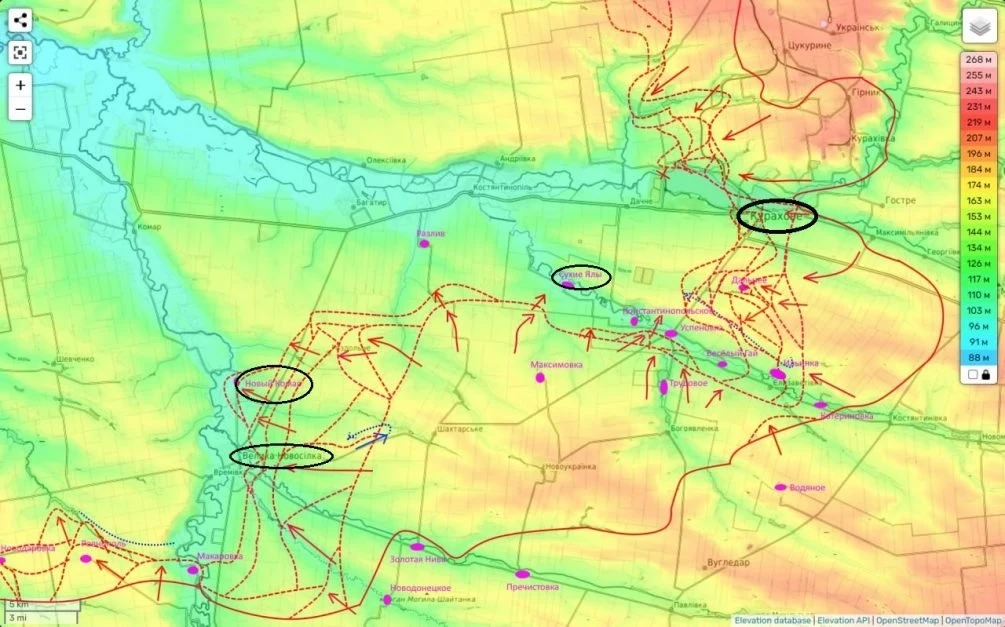На высотах вокруг Курахово противник испытывает все большее давление, и их удержание позиций становится все менее вероятным. Наши успехи на севере Кураховского водохранилища и контроль над населенным пунктом Старые Терны создают угрозу для гарнизона города с северной стороны.