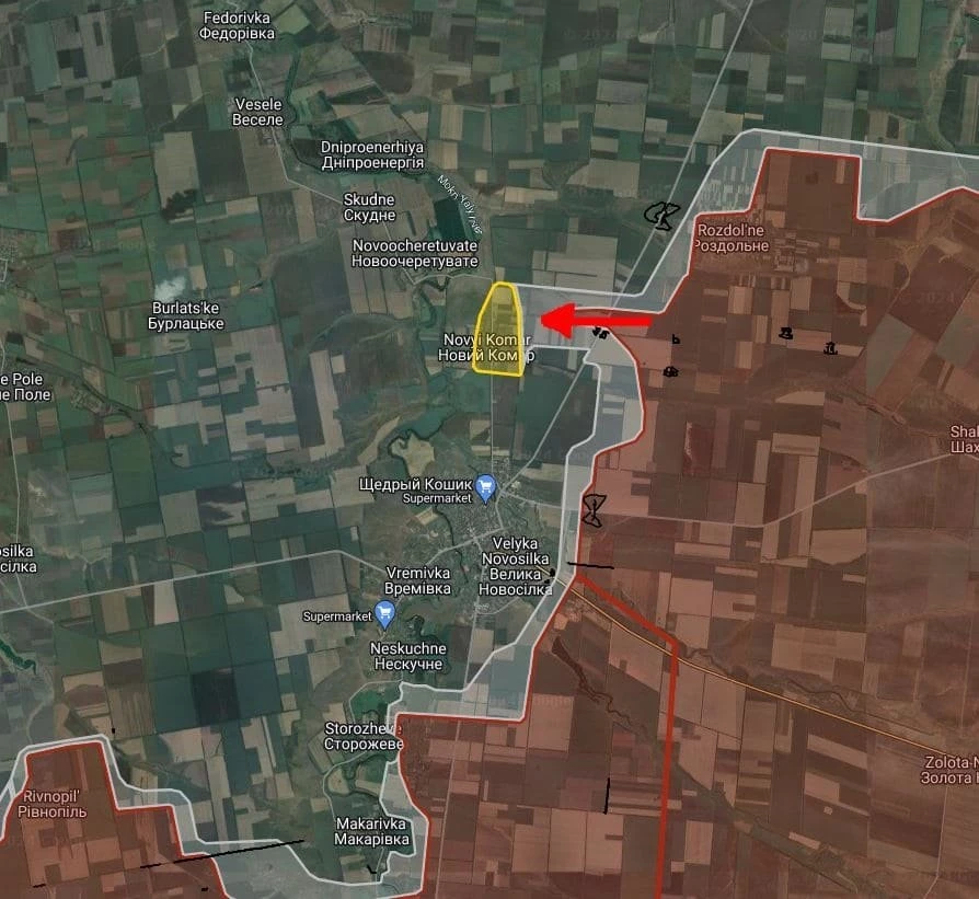 На Великоновосёлковском направлении российские войска ведут штурмовые действия в восточной части Нового Комара, имеются тактические успехи.