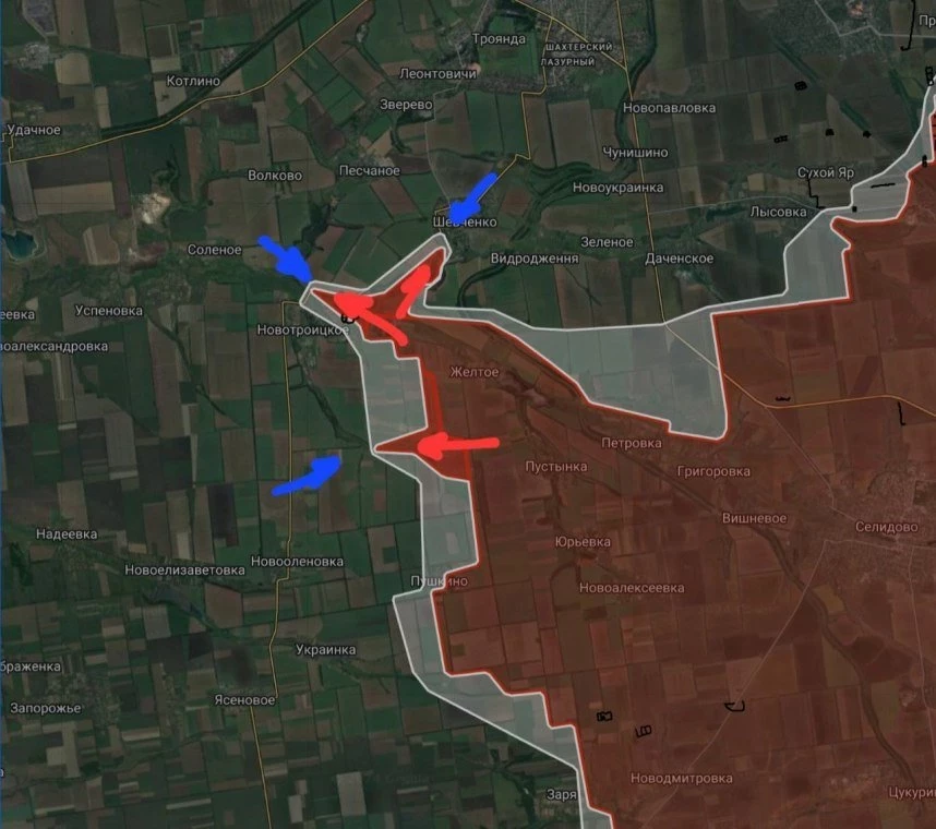 На Покровском направлении ВС РФ удалось закрепится на западной окраине Шевченко, вдоль лесополосы севернее Новотроицкого и южнее вдоль балки Сазоновка, под контроль взята Новодмитровка. В Заре российские войска продолжают атаковать в западном направлении с восточной части населённого пункта.