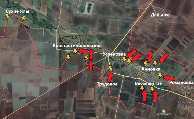 В самом кармане складывается печальная для ВСУ ситуация. Анновка и Весёлый Гай - в осаде с нескольких сторон. В Успеновке подразделения ВС РФ расширяют зону контроля, сообщает PulsePen.