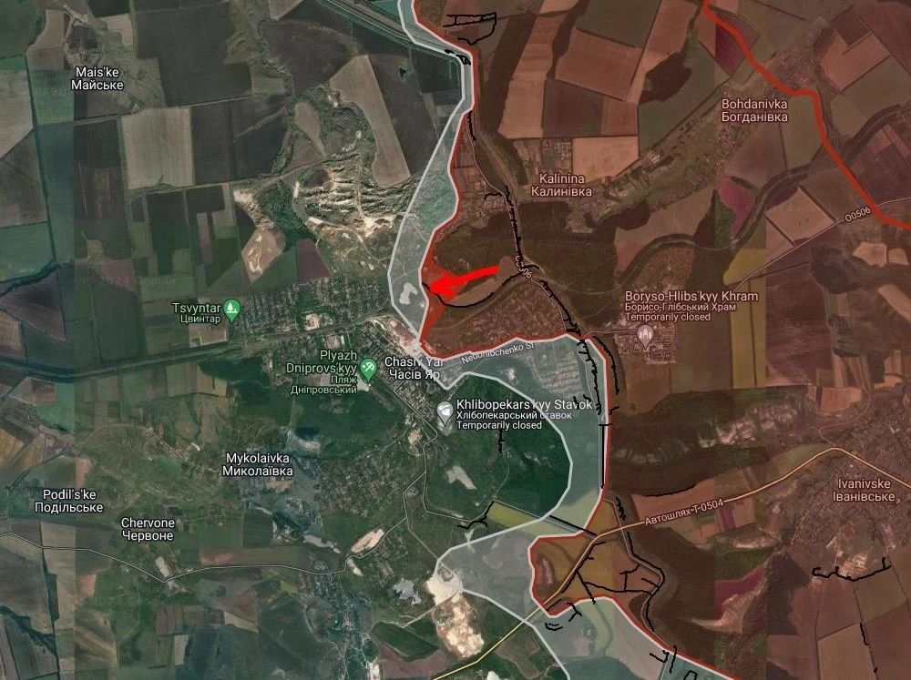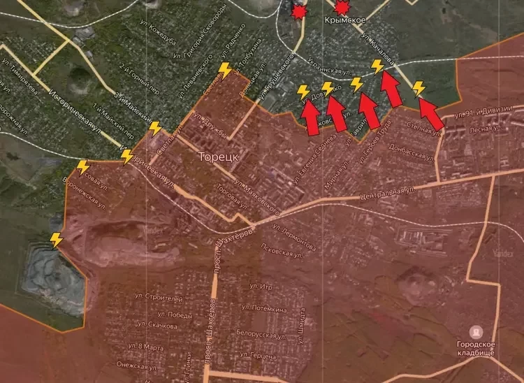 Подразделения ВС РФ существенно продвинулись в северной части - по направлению к Крымскому. Сообщается, что сейчас наносятся удары по позициям ВСУ в Крымском и чуть западнее - на территории шахты «Торецкая».