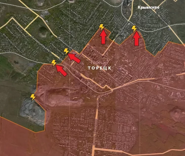 На Торецком направлении в Торецке наши бойцы продолжают наступление в центральной части города. На днях штурмовые отряды ВС РФ закрепились в районе центрального рынка. Теперь же они пытаются продвинуться дальше на запад, в сторону террикона. Также продолжаются попытки прорваться к Крымскому и шахте «Торецкая». Впоследствии это позволит выйти к железной дороге. За последние сутки продвижений на этом участке нет. Враг продолжает жаловаться на то, что оборонять позиции становится всё сложнее.