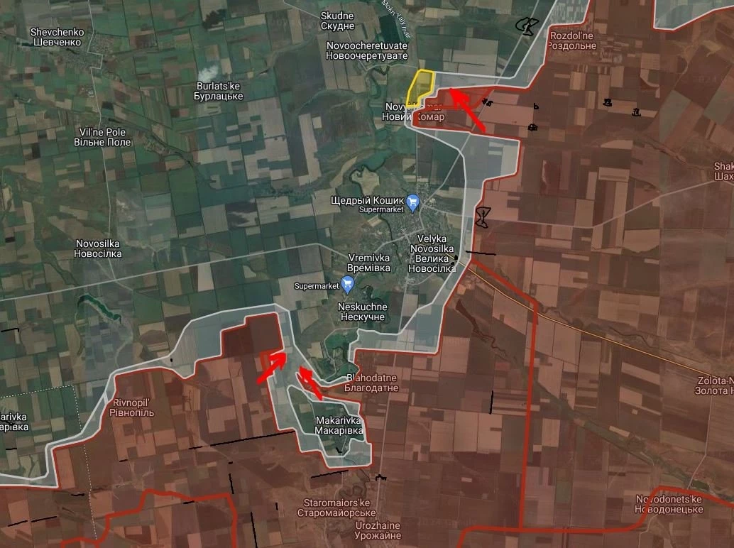 Подразделения ВС РФ активно занялись южным участком. Наши бойцы активно продвигаются юго-западнее и юго-восточнее Великой Новосёлки, постепенно беря в клещи ряд населённых пунктов (Макаровка, Сторожевое, Нескучное). Некоторые источники сообщают, что ВСУ уже давно нет в Макаровке.