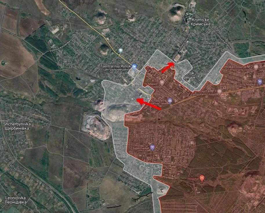 На Торецком направлении в южной части Торецка ВС РФ давят в районе Забалка, имеются тактические успехи. В центральной части города российские войска продолжают штурмовые действия севернее терриконов шахты «Центральная» и севернее квартала многоэтажных домов в направлении стадиона «Авангард».