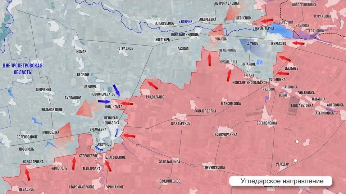 На восточном фланге Покровского фронта российские подразделение установили контроль над половиной села Воздвиженка. Под Покровском армия России освободила Новотроицкое, а севернее заняла Песчаное, а судя по некоторым источникам, и Волково. В Песчаном была занята стратегически важная для украинской металлургической отрасли Шахта №3. Еще одна подобная шахта находится в Удачном, в 9 км к западу от Песчаного. Южнее идут ожесточенные бои по линии Нововасильевка-Новоелизаветовка. Нововасильевку наши штурмуют с двух сторон, ведут бои на юге села. Новоелизаветовка перешла под контроль ВС РФ. Между этими сёлами наши продвинулись по высотам, пересекли балку Шумилова и вышли к опорным пунктам противника севернее Новоелизаветовки и северо-восточнее Надеждинки. От Украинки наши штурмовики давят с двух сторон на Ясеновку, от которой идёт прямая рокадная дорога на юг к Андреевке. По оперативным данным, противник потерял контроль над Шевченко, что западнее Старых Тернов.