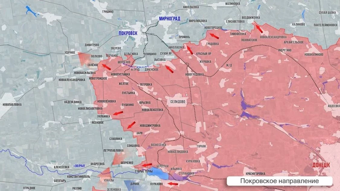 Авдеевское направление, ставшее Покровским, гремело с начало года. Уже в феврале был установлен контроль над пятью населёнными пунктами: Авдеевкой, Северным, Ласточкиным, Петровским и Победой. Взятие Авдеевки - мощного узла обороны ВСУ на Донбассе – стало первой стратегической наступательной операцией этого года. Когда в мае наши войска заняли еще девять наследных пунктов, появилось понятие «очеретинский цветок», включающее само Очеретино и окружающие его сёла. А далее начался охват Покровска. В октябре было освобождено Селидово - важный опорный пункт обороны Покровска. В оборону города ВСУ включили инфраструктуру закрытой шахты им.Коротченко с расположенными там терриконами. С 28 октября Селидово стало надежным российским плацдармом для наступления на Покровск, что примерно в 20 км. Именно из Селидово ВС РФ наступают, постепенно охватывая Покровск.