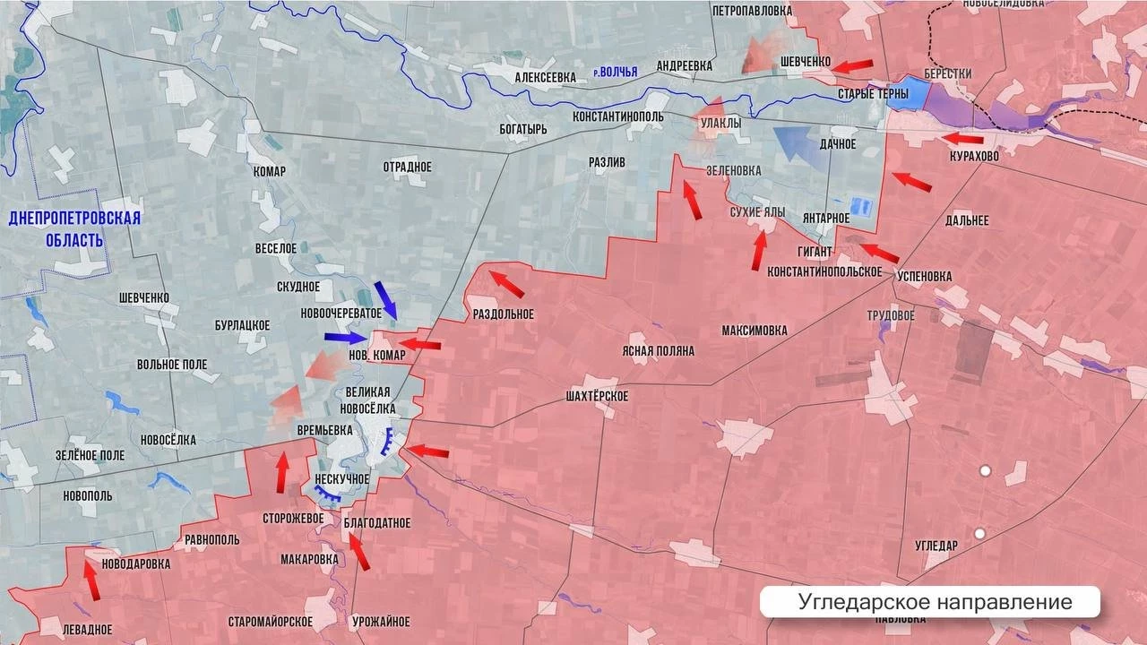 На Угледарском фронте ВС РФ освободили еще примерно 4 км², взяв под контроль участок дороги от Великой Новосёлки до Новосёлки. В районе Улаклы-Константинополь-Разлив идут ожесточённые бои. Противнику пока удается сдерживать атаки нашей армии. Возобновились интенсивные бои за Янтарное, западнее которого наши отбили у ВСУ несколько позиций. Стремительно ухудшается положение гарнизона ВСУ в районе Дачного. ВС РФ заняли опорный пункт на северном берегу Волчьей и установили огневой контроль над участком трассы Курахово-Запорожье.