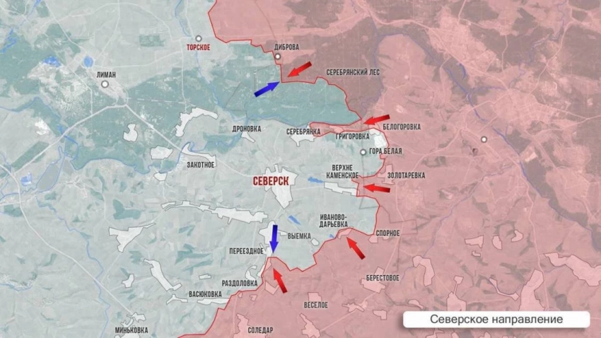 В Часов Яре ВС РФ наступают в промзоне на юго-восточной стороне комбината и атакуют позиции ВСУ с северо-западного фланга. По данным ВСУ, наши зашли в Ступочки и продвинулась к лесу Клебан-Бык, что в устье одноименной реки. Продвинулись наши и от Белой Горы и Дылеевки. Если украинские данные о контроле ВС РФ над остатками Клещеевского плацдарма подтвердится, это будет означать, что оборона врага между Торецком и Часов Яром фактически рухнула.