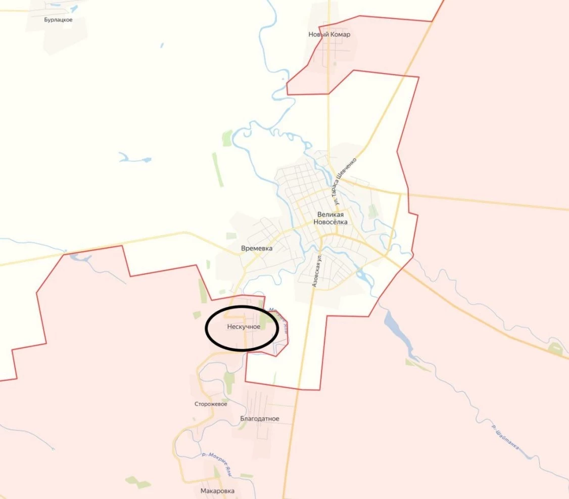 На ВеликоНовосёлковском направлении ВС России освободили Нескучное. Поступило подтверждение данной информации. На данный момент завершена зачистка около 400 строений, подразделения закрепились на достигнутом рубеже. Только за два дня боёв уничтожено более 70 военнослужащих 110 омбр противника, 7 человек с состава этой же бригады добровольно сдались в плен. Продвижение воинов-дальневосточников составило более 2 км в глубину и по фронту, тем самым завершив еще один важный шаг в более масштабной операции по освобождению Великой Новосёлки.