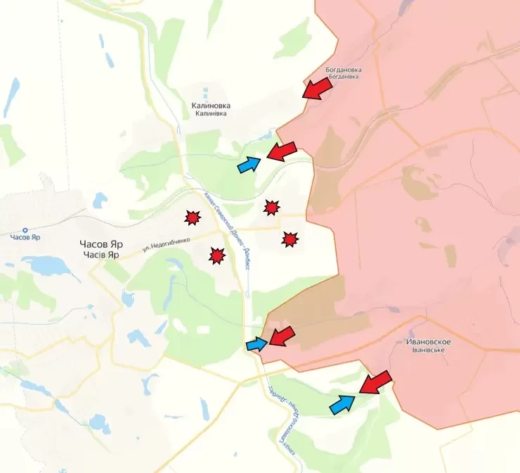 На Артёмовском направлении российские войска готовятся к штурму части канала Северский Донец - Донбасс, что отделяет микрорайон Канал от основной застройки Часов Яра. От юга происходят попытки прорыва обороны противника возле трассы Т-05-04. ВС РФ подошли к ключевому участку обороны в районе Часов Яра. Это место считается определяющим для дальнейшего развития событий в регионе. Передовые отряды расположились возле труб канала Северский Донец. В район были переброшены подразделения Кракена и 18 бригада НГУ, которая ранее базировалась возле Тернов.